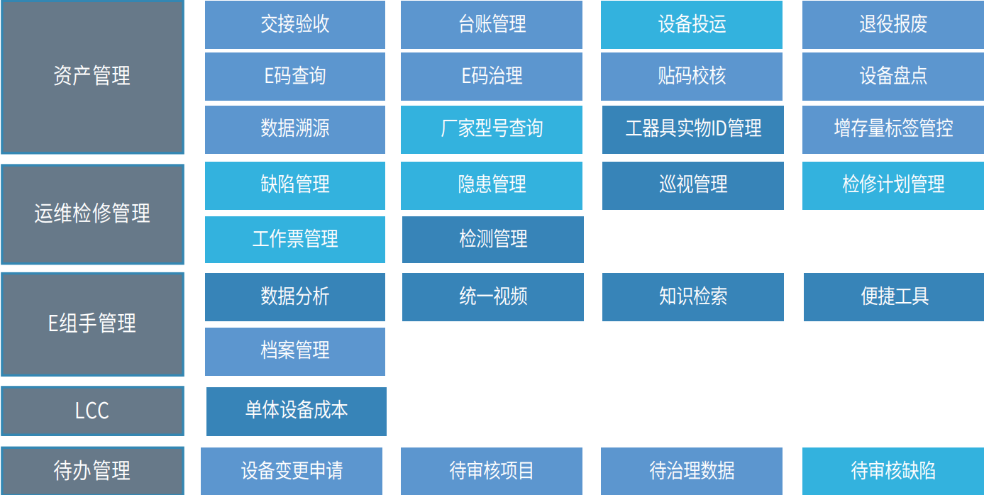 现代设备管理实物ID应用贯穿各生命周期的可识别、唯一ID码,实物“ID”。现代设备管理体系移动门户贯彻现代设备管理体系建设任务,基于实物”ID”打造面向班组全业务的移动应用,实现生产验收、设备异动、标签管控、巡检、检(抢)修、两票、试验、检测、数据治理等流程在线办理 和跨专业业务在线协同 。打造企业级移动门户,促进数据源端采集、作业移动办理、现场实时管理,满足电力班组生产实际需求,实现班组减负和提质增效, 支撑国网公司设备管理数字化转型。以实物ID为主 线,建立设备全寿命过程管理机制,优化各类信息资源获取方式,实现各阶段重要信息系统间可穿透查询打通设备制造、建设及运检环节的信息壁垒,实现设备信息追溯、设备异动监控、设备成本归集。