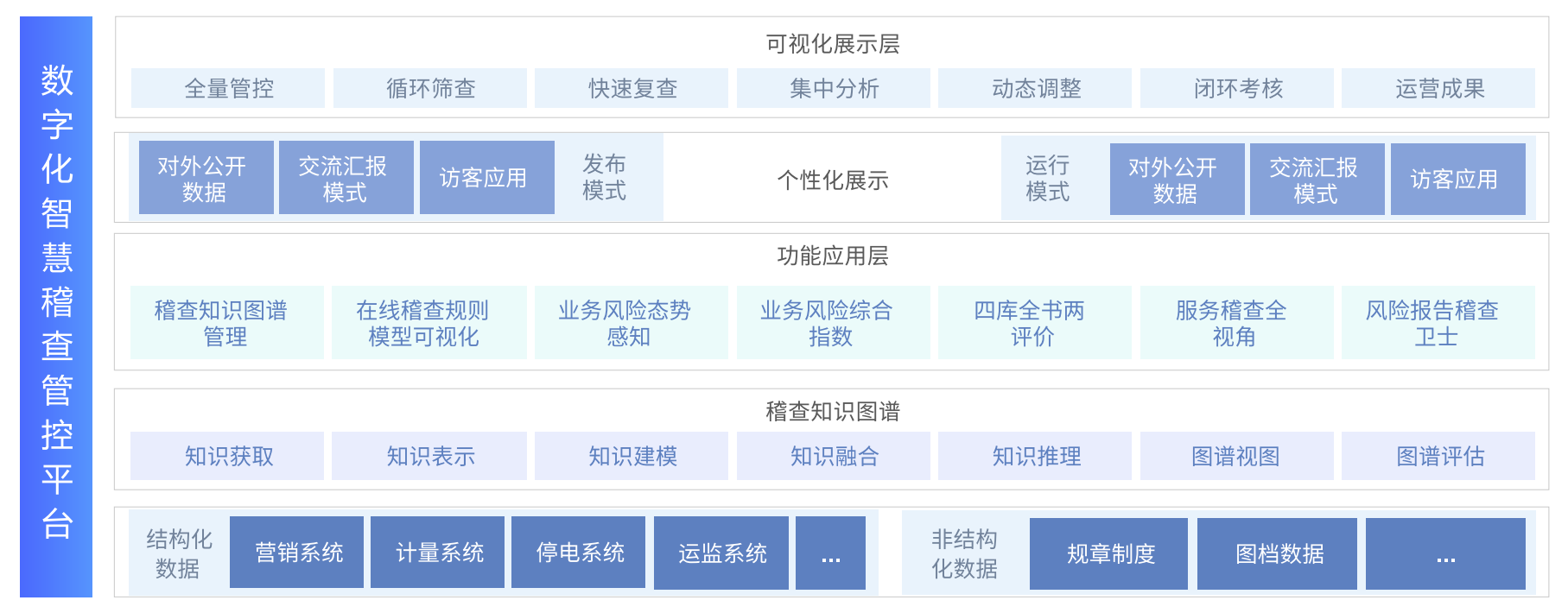 采用自然语言处理技术、知识图谱技术结合数据挖掘技术,对营销、计量等系统中的结构化数据及稽 查业务知识等非结构化数据进行图谱构建及数据建模,构建事前预防、事中处置、事后分析的风险管控体系,实现稽查知识图管理、在线稽查规则模型可视化、业务风险态势主动感知、业务风险综合指数、业务风险预警推送、四库全书两评价、服务查全视角、风险报告稽查卫士等功能,基于L2智慧稽查,全面构建“网、线、点”立体化稽查网,有效防范稽查业务风险,提高稽查人员工作效率及 能力。