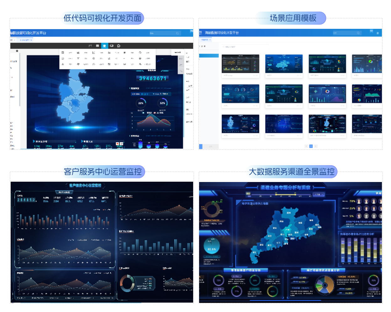 针对各行业的各种展现场景进行快速可视化的套装软件,以简洁式操作和配置为主,可针对突发业务 展现需求进行及时构建和响应。平台的使用无需专业技术人员介入,可完全面向业务人员,通过简单的 自助拖拽实现展现效果的呈现,便于以业务需求为主导的方式进行业务数据的自主探索。该平台提供丰富的可视化展现方式,支持多尺寸终端的自动适配,以最大程度降低使用人员的技术门槛,解放业务人 员专心解决业务问题、探索业务规律。