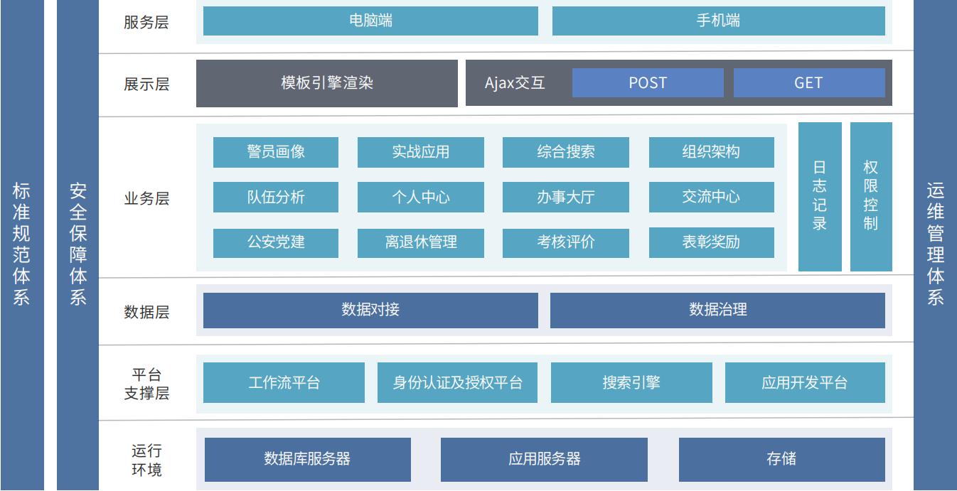 政工云平台以全面整合队伍、工作、生活信息,挖掘警队大数据价值为落脚点,以服务决策、服务实战、服务民警为着力点。通过自动抓取请假、调配、培训、下派、临时机构任务等数据,生成实时警力。完成数据深层次挖掘分析,辅以生动的图形展示手段来服务实战,提升公安队伍战斗力从而服务决策、服务实战、服务民警。